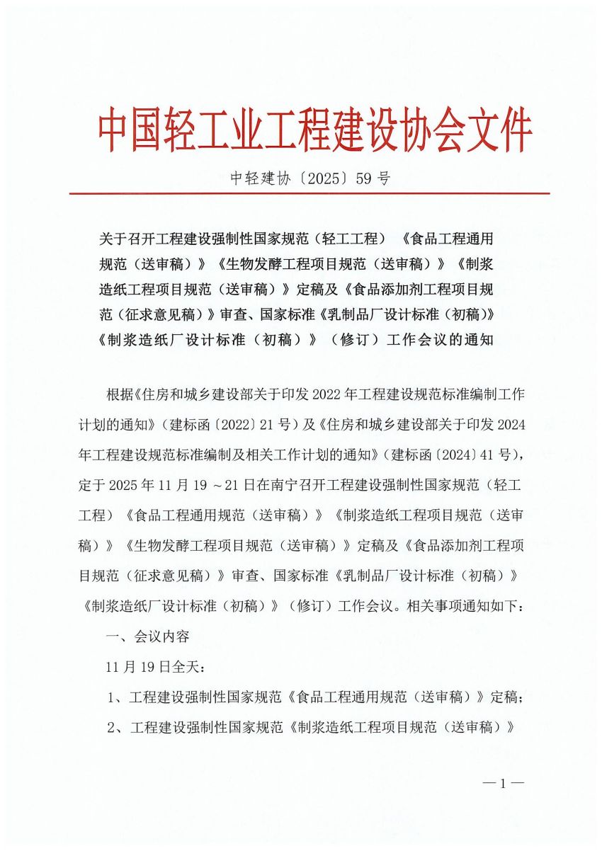 关于召开工程建设强制性国家规范(轻工工程) 《食品工程通用规范(送审稿)》《生物发酵工程项目 规范(送审稿)》《制浆造纸工程项目规范(送审稿)》 定稿会议通知