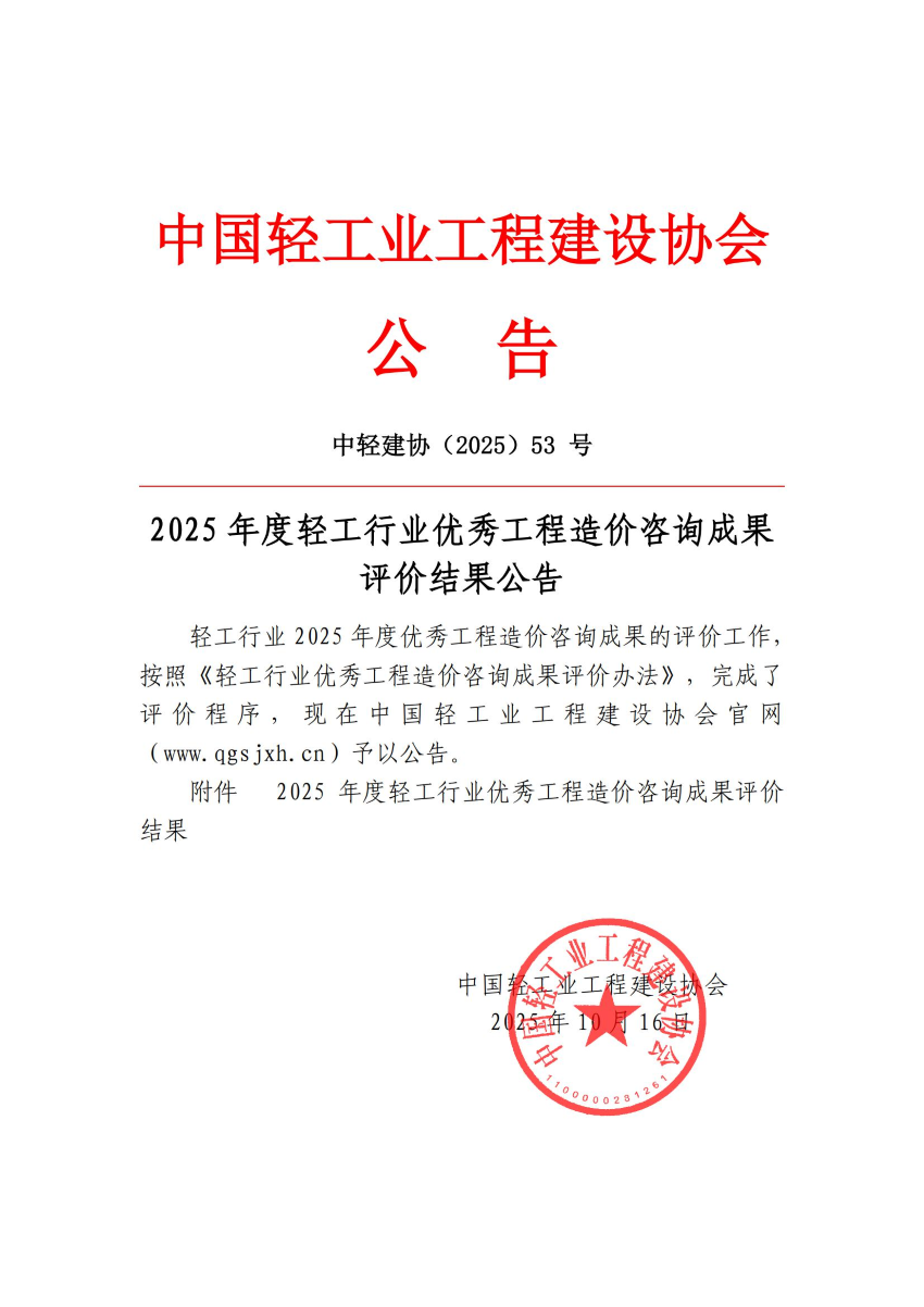 2025年度轻工行业优秀工程造价咨询成果 评价结果公告